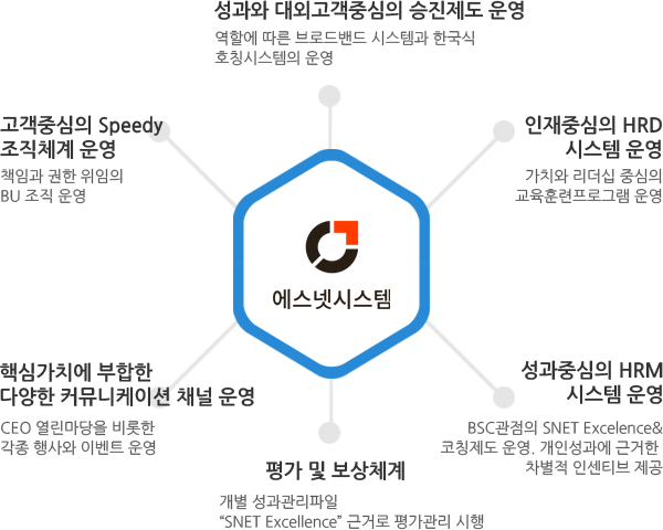 • 평가 및 보상 체계 - 당사는 개인의 역량과 업적을 공정하게 평가하기 위하여 개인별 성과 관리 파일인 "SNET Excellence" 를 근거로 평가관리가 이루어지고 있습니다. 그리고 평가 자료는 개인의 연봉 책정 및 인센티브에 가장 중요한 요소로 반영되고 있습니다.